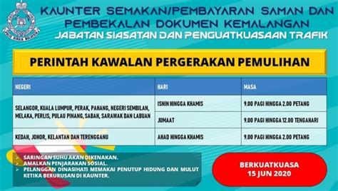 Kaunter Bayaran Saman Trafik : Ketua polis negara tan sri abdul hamid bador telah memaklumkan, semua kaunter pembayaran saman trafik dan permohonan lesen di seluruh negara berikutan pelaksanaan perintah kawalan pergerakan bermula hari ini sehingga 31 mac 2020.