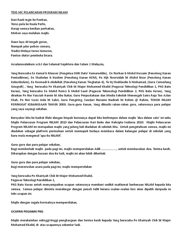 Teks Ucapan Pelancaran Program Nilam Doc from imgv2-2-f.scribdassets.com Ucapan perasmian penutup program promosi & perpaduan murid asrama malaysia kpm peringkat kebangsaan. Teks ucapan 2021 induction programme for judicial commissioners 29 march 2021, opening remarks by tun tengku maimun binti tuan mat, the chief justice of malaysia. Masukkan teks lengkap untuk dibaca dalam area teks utama. Kemudian memiliki pesan penting dan kesan yang menyentuh bagi para pembacanya. Download lagu teks ucapan perasmian penutup mp3 dapat kamu download secara gratis di metrolagu. Teks ucapan pengarah program : Datuk kamis samin, ketua pentadbir parlimen malaysia dan seluruh ahli jawatankuasa taska parlimen. Sebagai ucapan selamat datang kepada bapak/ibu sekalian.