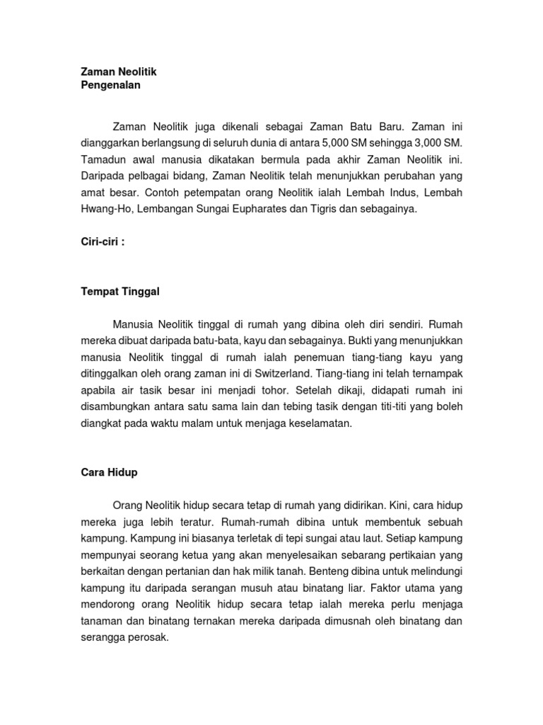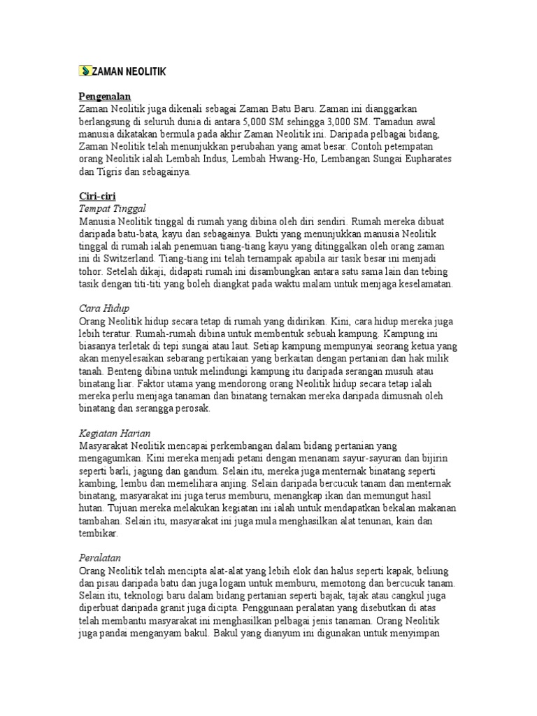 1 0 Nota Ringkas Zaman Pra Sejarah Spmflix Com Free Spm Tuition from www.filepicker.io Tempat tinggal manusianya sudah menetap. ✓ masyarakat mesolitikum menguburkan orang mati simak juga: Kehidupan manusia mulai meningkat di zaman neolitikum. Unsur kebudayaan itu seperti peralatan yang terbuat dari batu yang diasah, peternakan, pertanian menetap, dan pembuatan tembikar. Dalam kelangsungan kehidupan dimasa nelitikum , dimana pada saat itu keadaannya telah berkembang, serta mereka juga telah mulai mengenal cara bercocok tanam meski metode yang pakai masih sangatlah sederhana. Ciri ciri zaman paleolitikum, mesolitikum, dan neolitikum. √ sejarah zaman neolitikum lengkap dan mudah dipahami. Zaman ini menjadi awal terbentuknya kerak bumi dengan keadaan yang masih belum stabil.